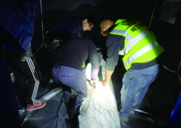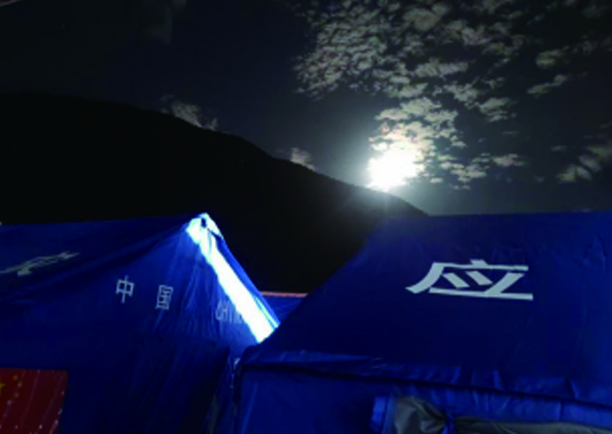 9月8日晚,灾后安全排查队在手机照明中搭建帐篷