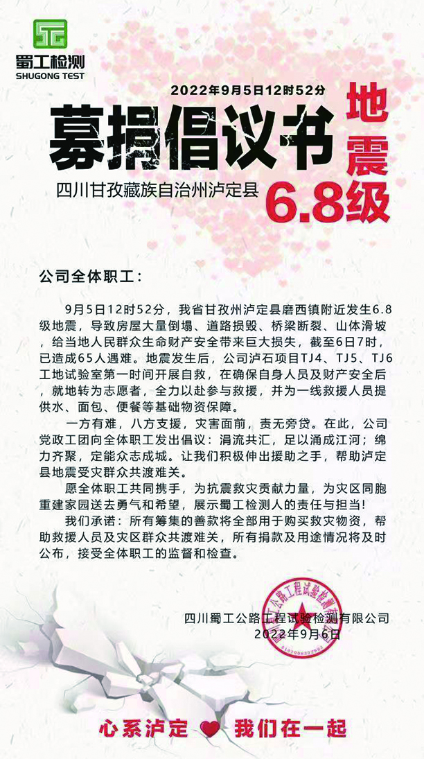 一方有难,八方支援。灾情发生后,蜀工检测公司心系灾区、快速行动,面向全体职员工发出募捐倡议,为抗震救灾贡献力量,为灾区同胞重建家园送去勇气和希望。倡议发出后,广大干部职工积极响应、踊跃参与,截止9月6日20时,共筹集241名职工捐款30119元。活动筹集的款项将全部用于为一线救援人员提供矿泉水、牛奶、面包、便餐等基础物资保障。