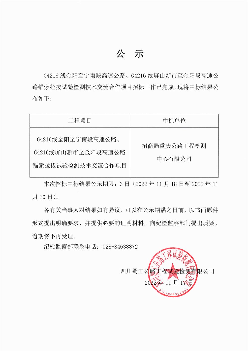 G4216线金阳至宁南段高速公路、G4216线屏山新市至金阳段高速公路锚索拉拔试验检测技术交流合作项目中标公示