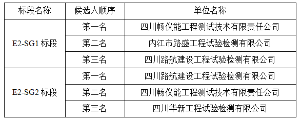四川蜀工公路工程试验检测有限公司于2019年7月2日组织了成乐高速公路扩容建设项目E2-SG1、E2-SG2标段工地试验室开标、评标工作。现予以公示,接受社会监督: