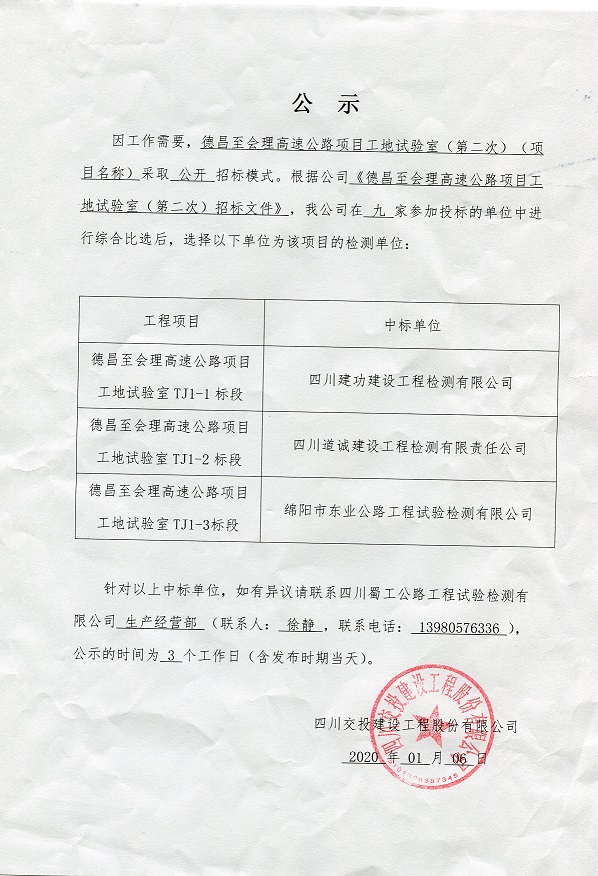 四川蜀工公路工程试验检测有限公司于2020年1月3日组织了德昌至会理高速公路项目工地试验室(第二次)TJ1-1、TJ1-2、TJ1-3标段开标、评标工作。现对评标结果予以公示,接受社会监督。