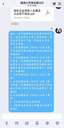 线上学习主要通过QQ群上传文件及通知,要求大家自行下载学习了川交投建设党〔2020〕20号《关于印发党支部主题党日活动实施办法的通知》、川交投建设党〔2020〕22号《关于转发〈交投集团党委转发〈省委组织部关于分区域推进基层党建引领构建城乡基层治理新格局的意见〉的通知〉的通知》以及川交投建设党〔2020〕23号《关于转发〈交投集团公司党委关于加强新时代统一战线工作的实施意见〉的通知》等文件精神,全面贯彻落实上级党委各项工作要求的同时,始终紧盯责任落实,坚持责任担当。
