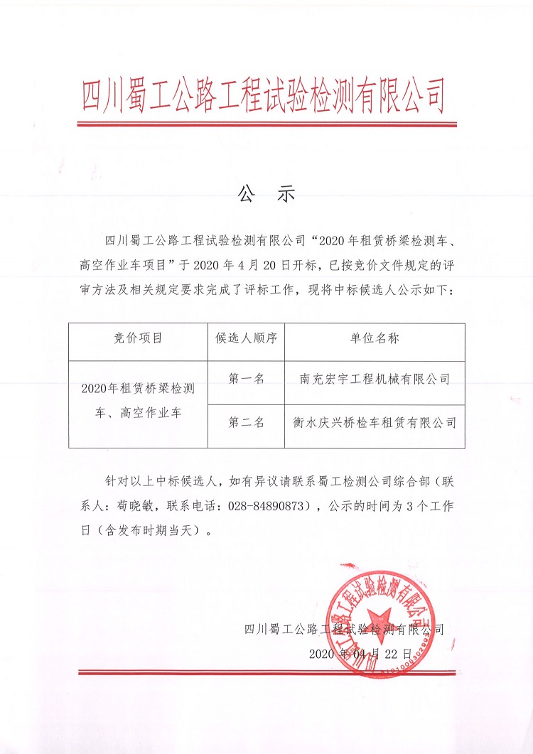四川蜀工公路工程试验检测有限公司于2020年4月20日组织了2020年租赁桥梁检测车、高空作业车项目开标、评标工作。现对评标结果予以公示,接受社会监督。