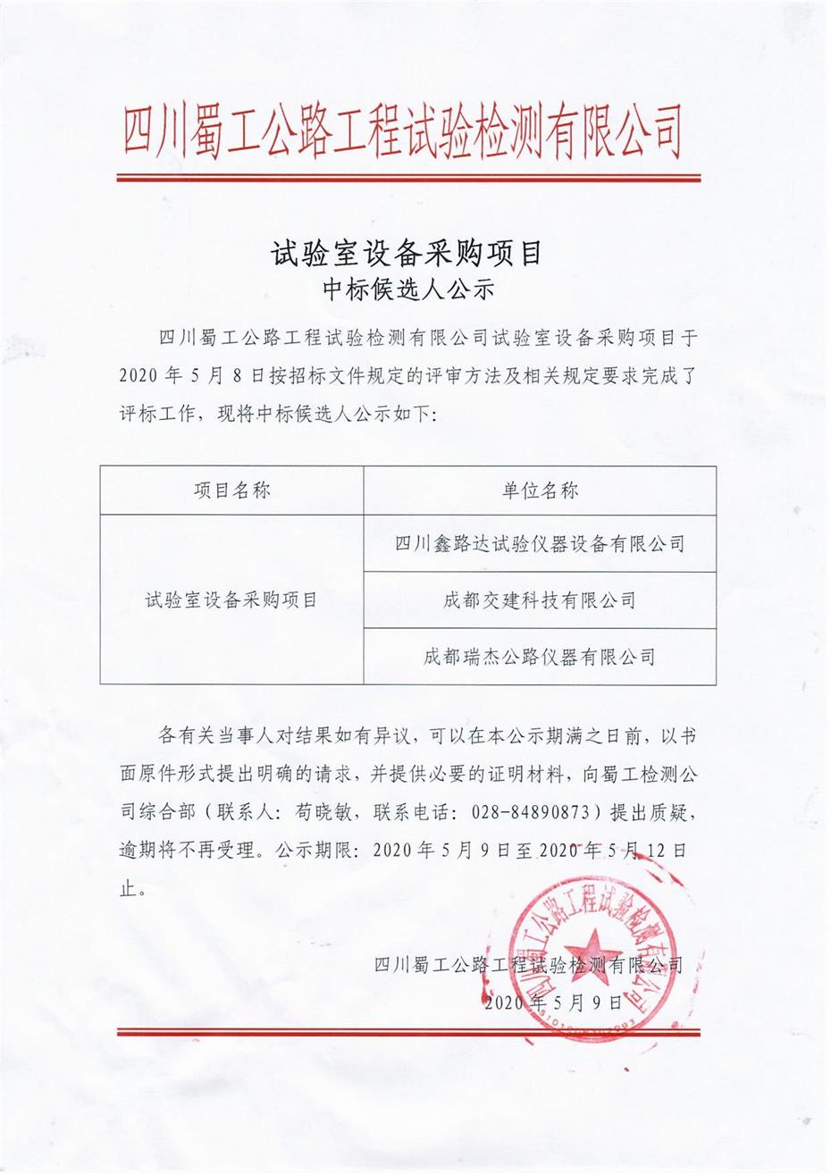 我公司试验室设备采购项目于2020年5月8日按招标文件规定的评审方法及相关规定要求完成了开标、评标工作。现对评标结果予以公示,接受社会监督。
