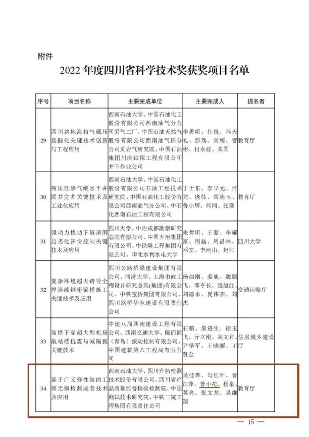 3月28日上午,四川省科学技术奖励大会暨第三届“四川杰出人才奖”颁奖仪式在成都市举行。蜀工检测公司技术负责人、体系运维中心总监曾小花参研的“基于广义弹性波的工程无损检测成套技术及应用”荣获“四川省科学技术进步奖二等奖”。