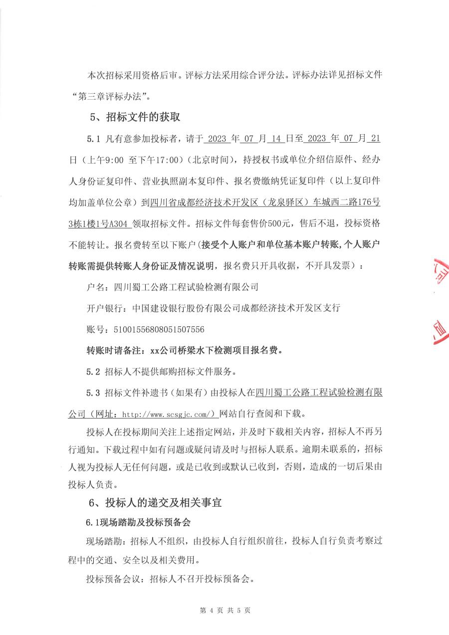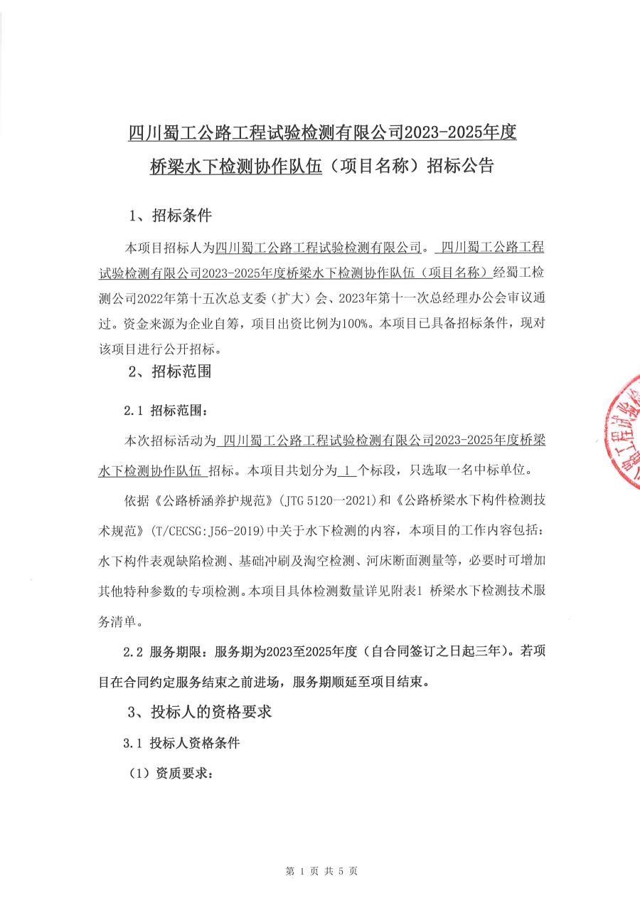 四川蜀工公路工程试验检测有限公司2023-2025年度桥梁水下检测协作队伍招标公告