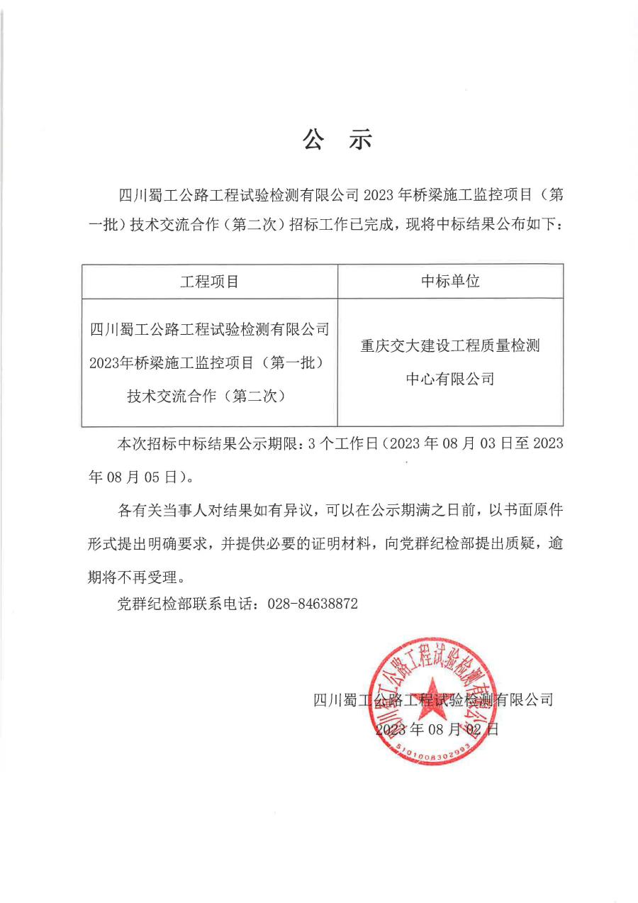 四川蜀工公路工程试验检测有限公司2023年桥梁施工监控项目(第一批)技术交流合作(第二次)中标公示
