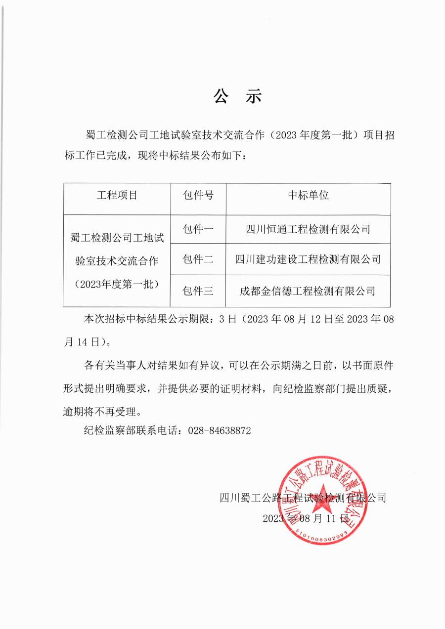 蜀工检测公司工地试验室技术交流合作(2023年度第一批)项目中标公示