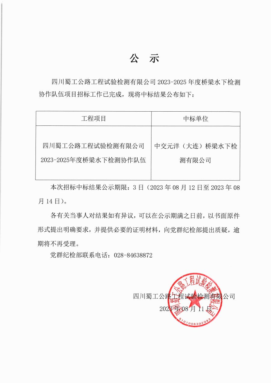 四川蜀工公路工程试验检测有限公司2023-2025年度桥梁水下检测协作队伍项目中标公示