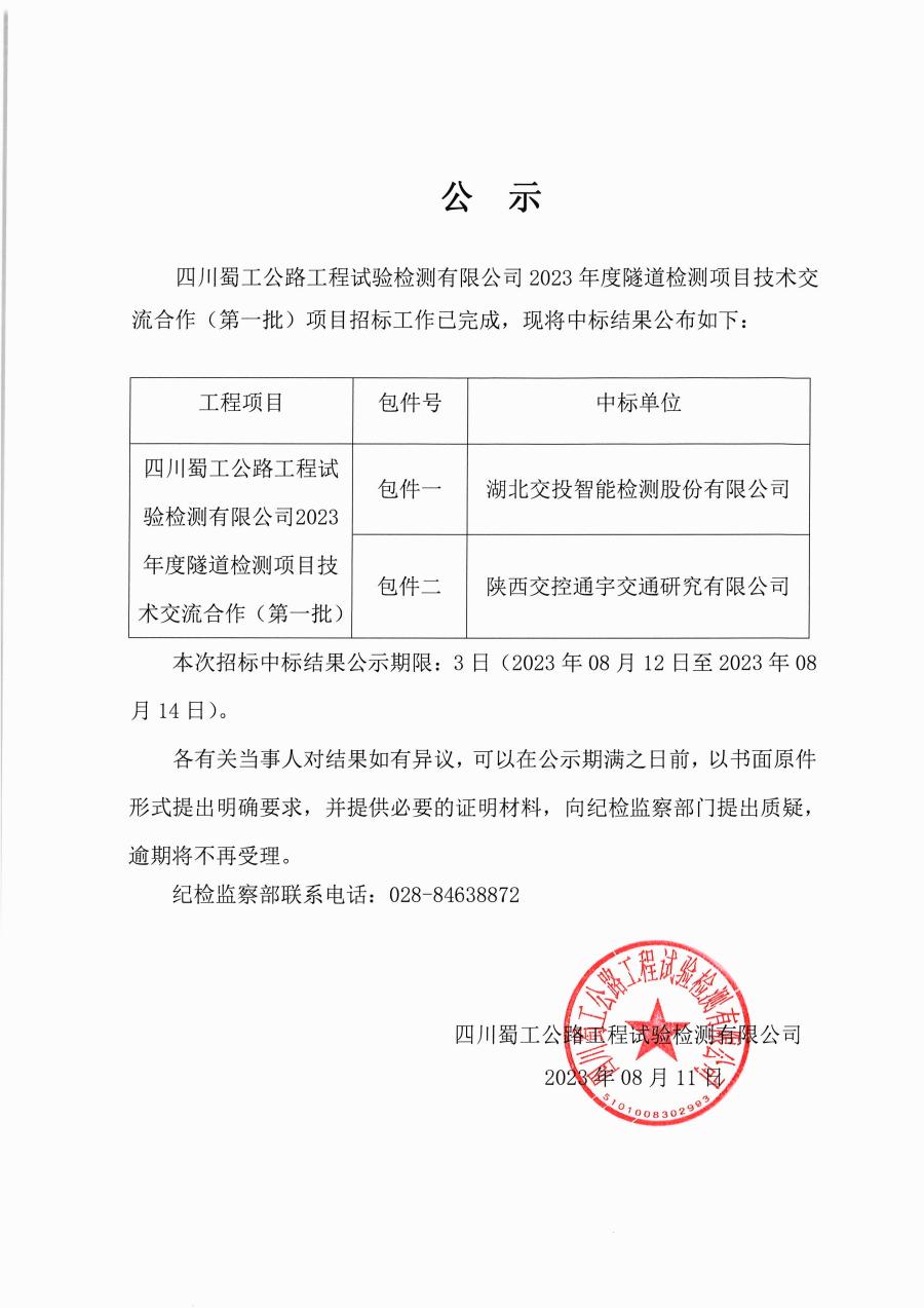 四川蜀工公路工程试验检测有限公司2023年度隧道检测项目技术交流合作(第一批)项目中标公示