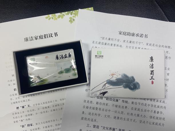 为引导党员干部职工常怀“廉洁心”,常念“紧箍咒”,勤敲“警醒钟”,不断强化廉洁从业意识,自觉做到谨言慎行,切实提高拒腐防变能力,蜀工检测公司为全体党员干部职工发放了一份“廉洁大礼包”,内含一张卡片式廉洁U盘、一封《廉洁家庭倡议书》、一份《家庭助廉承诺书》。