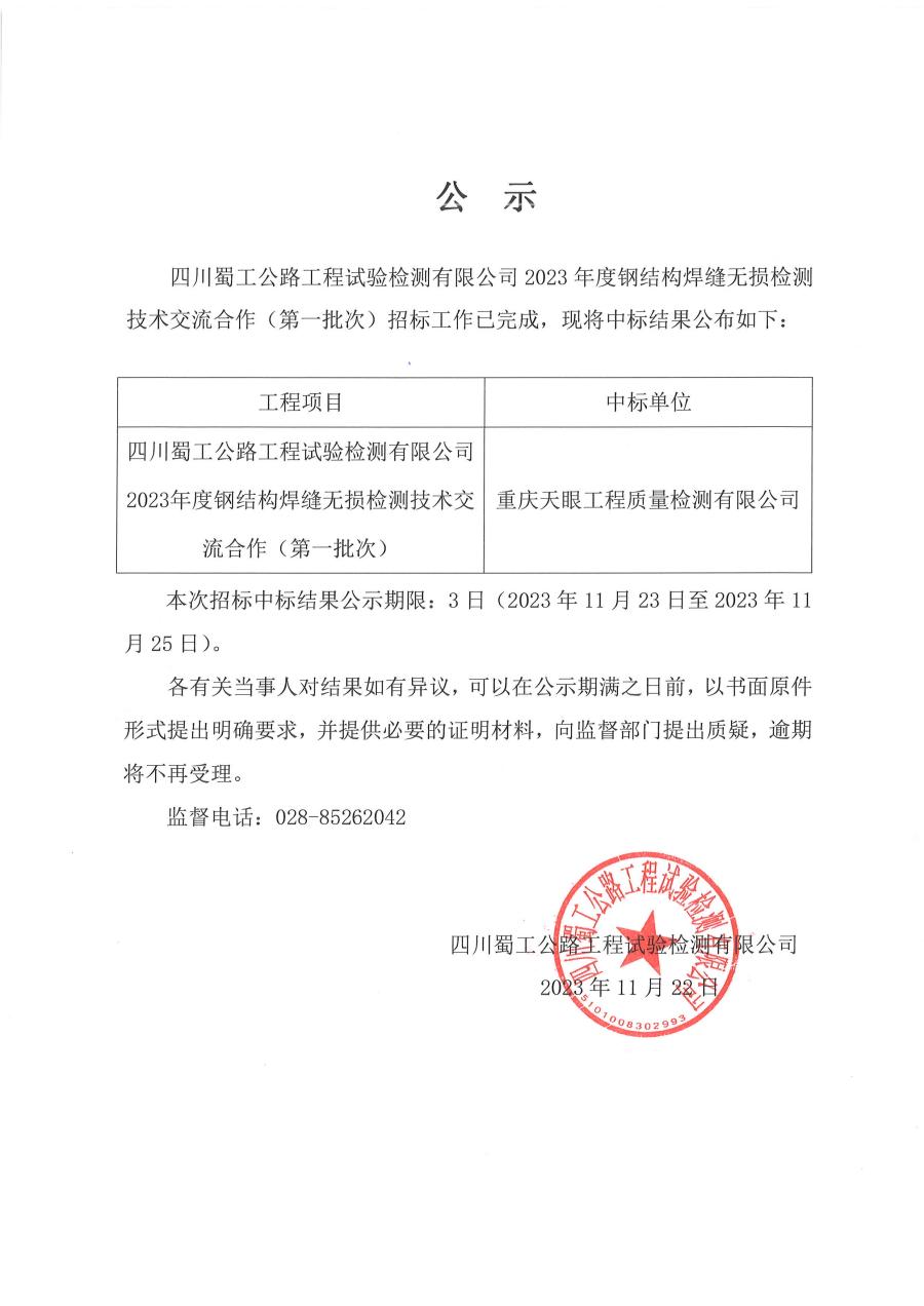 四川蜀工公路工程试验检测有限公司2023年度钢结构焊缝无损检测技术交流合作(第一批次)中标公示