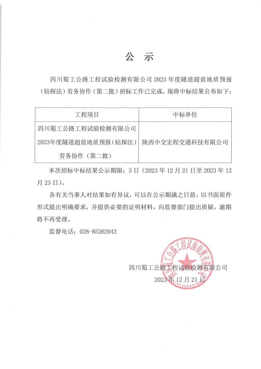 四川蜀工公路工程试验检测有限公司2023年度隧道超前地质预报(钻探法)劳务协作(第二批)中标公示