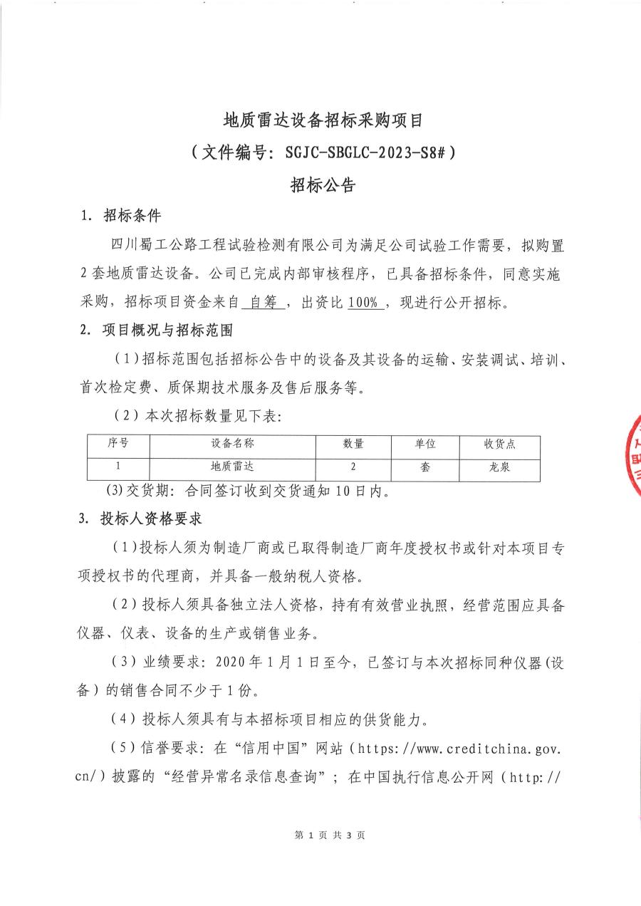 地质雷达设备招标采购项目(编号:SGJC-SBGLC-2023-S8#)招标公告