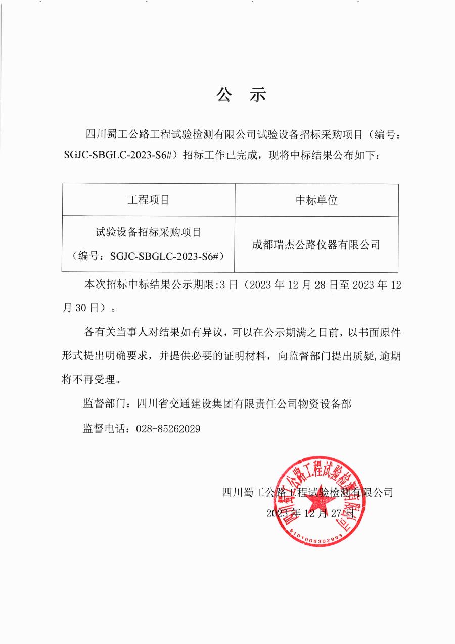 试验设备招标采购项目(编号:SGJC-SBGLC-2023-S6#)中标公示