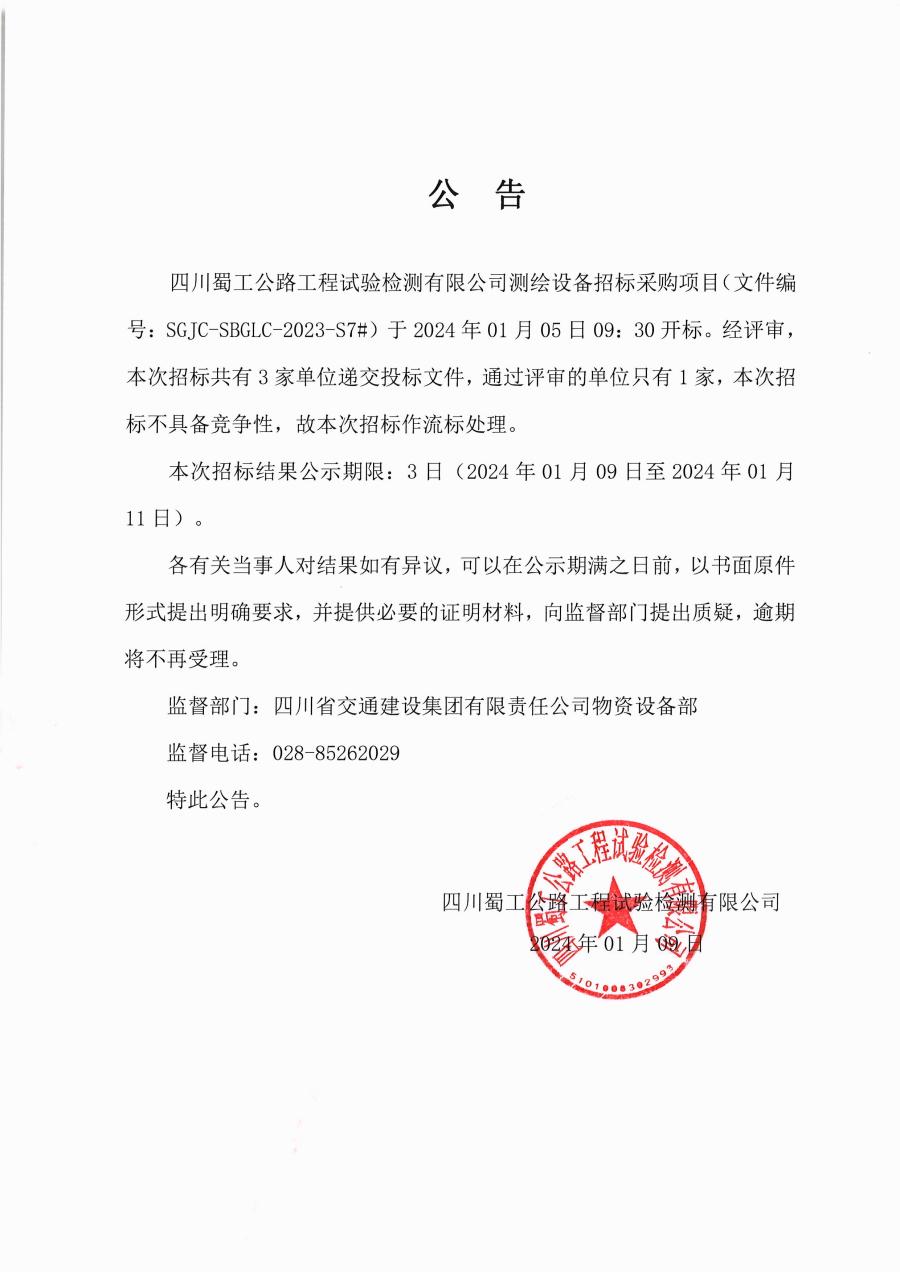 测绘设备招标采购项目(文件编号:SGJC-SBGLC-2023-S7#)流标公告