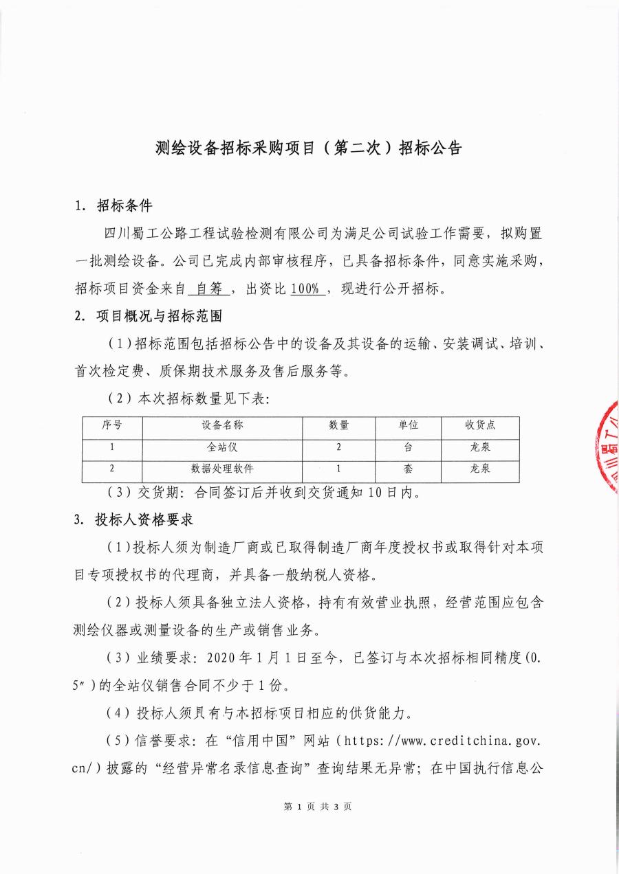 测绘设备招标采购项目(第二次)(文件编号:SGJC-SBGLC-2023-S7#)招标公告