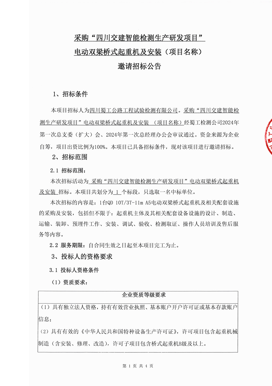 采购“四川交建智能检测生产研发项目”电动双梁桥式起重机及安装招标公告
