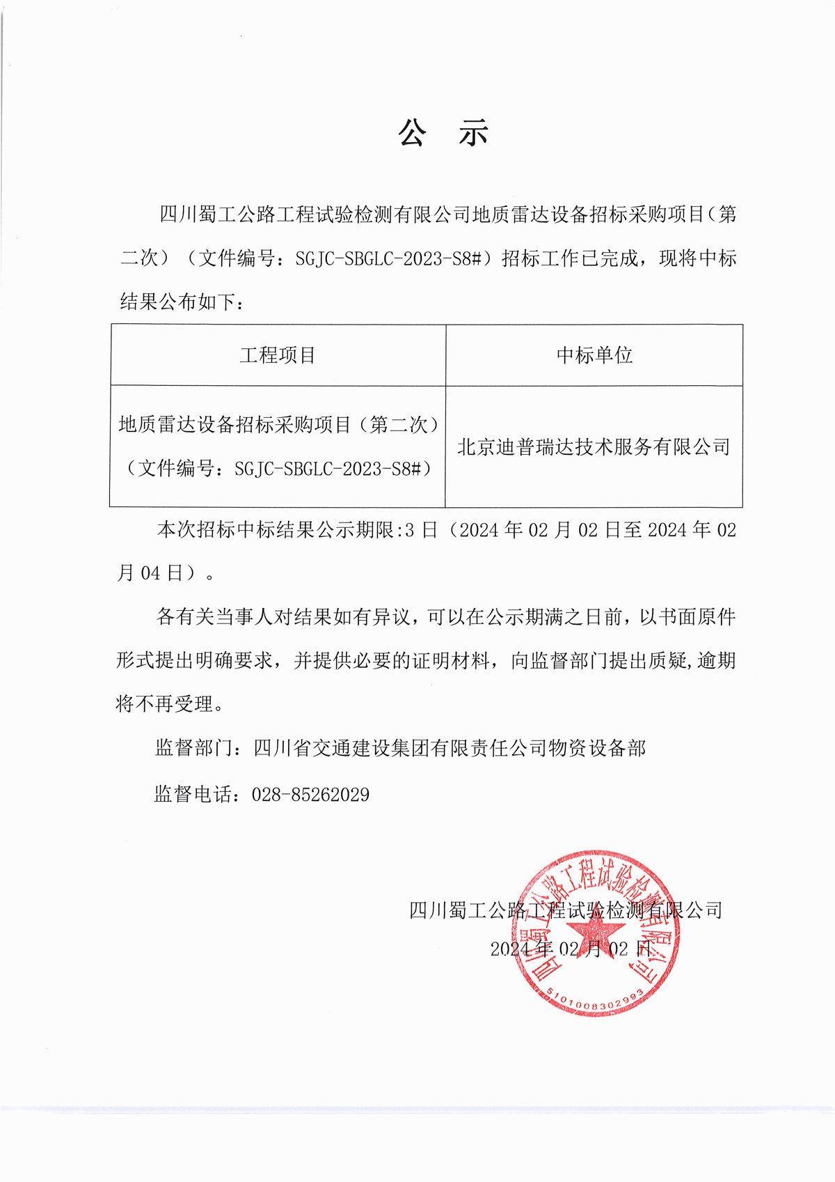 地质雷达设备招标采购项目(第二次)(文件编号:SGJC-SBGLC-2023-S8#)中标公示