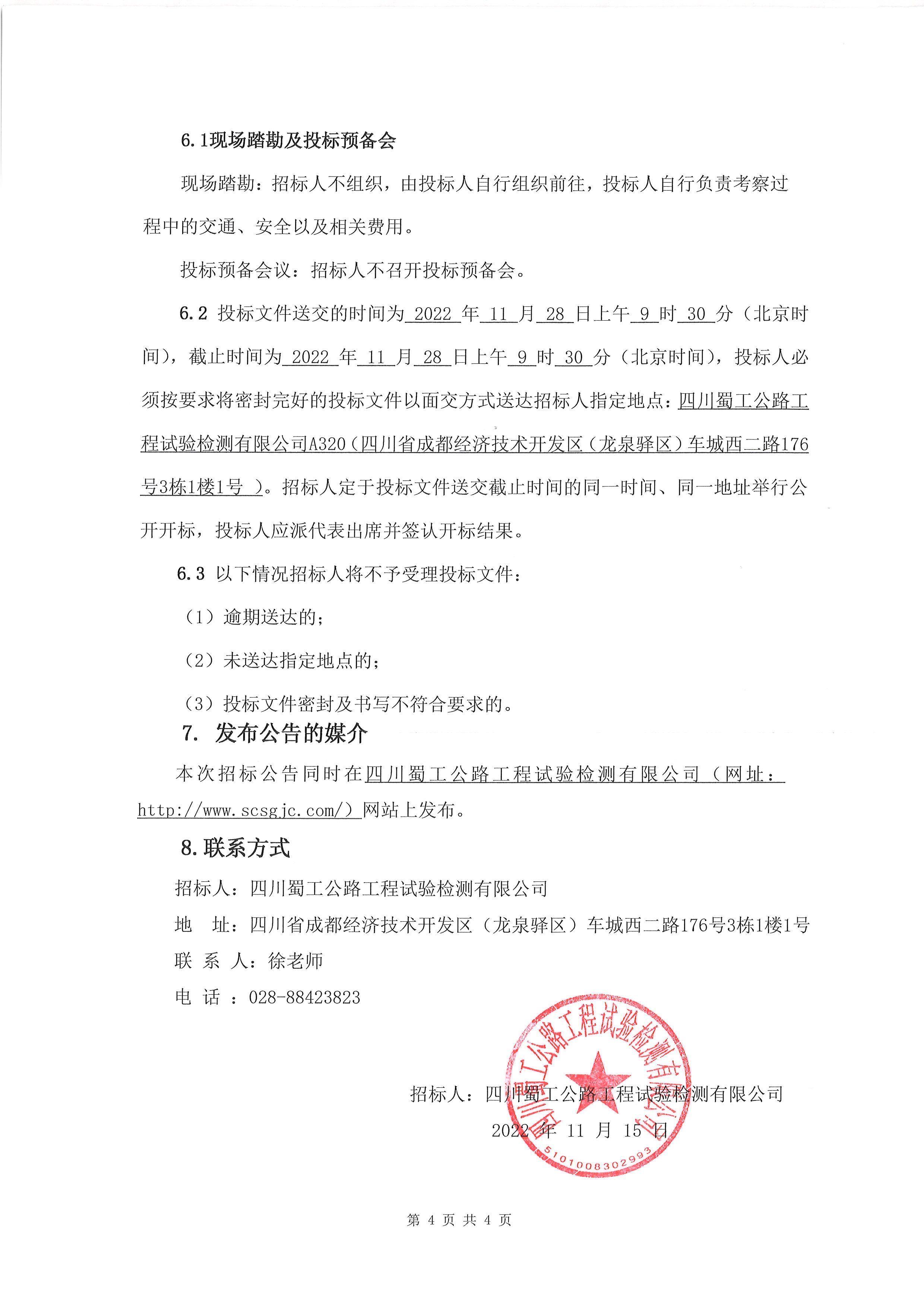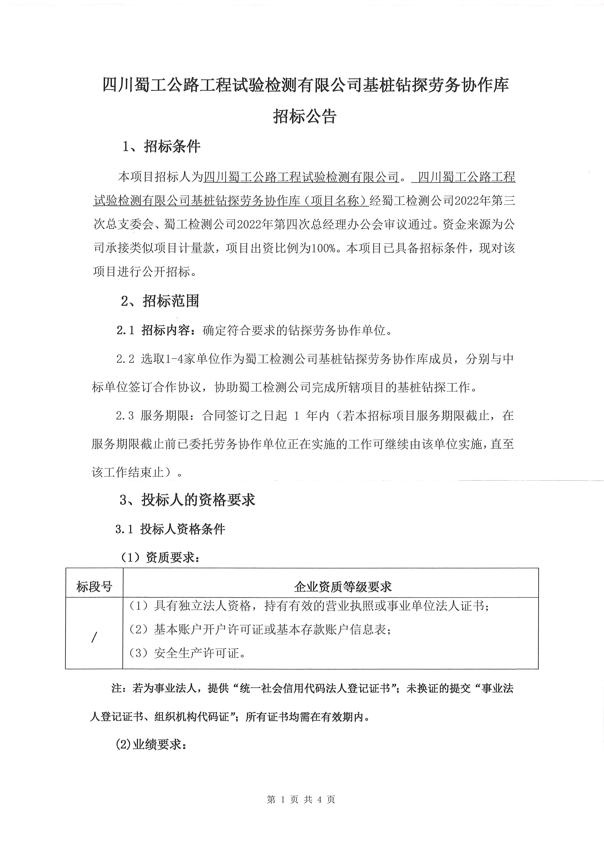 四川蜀工公路工程试验检测有限公司基桩钻探劳务协作库招标公告