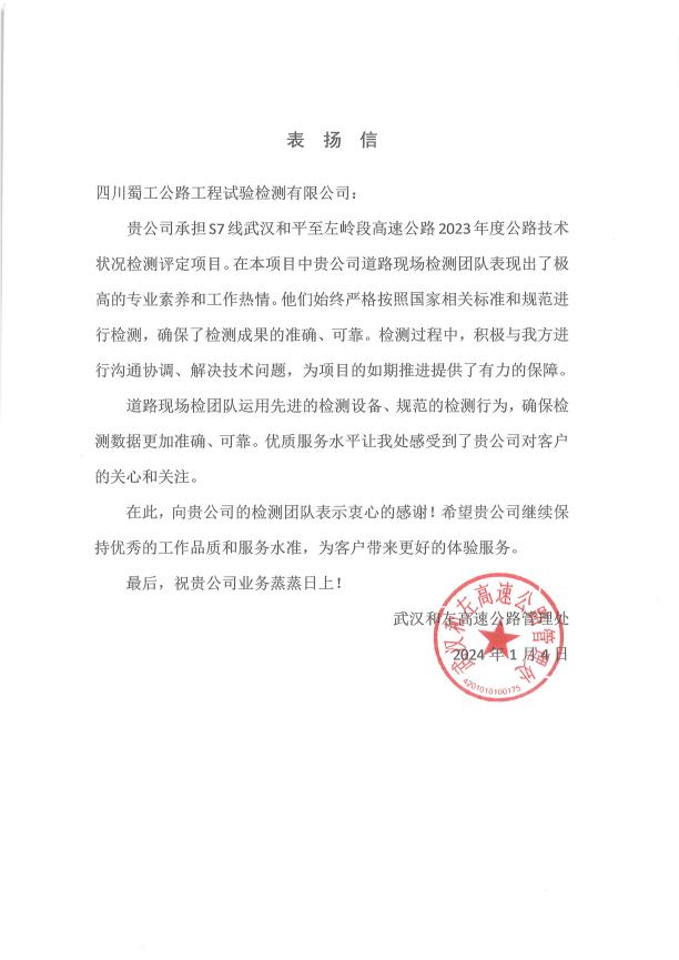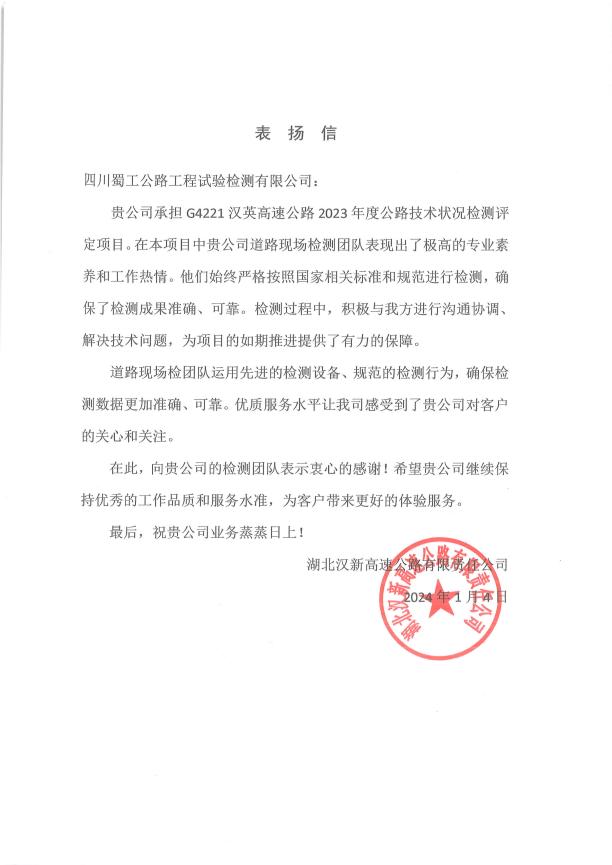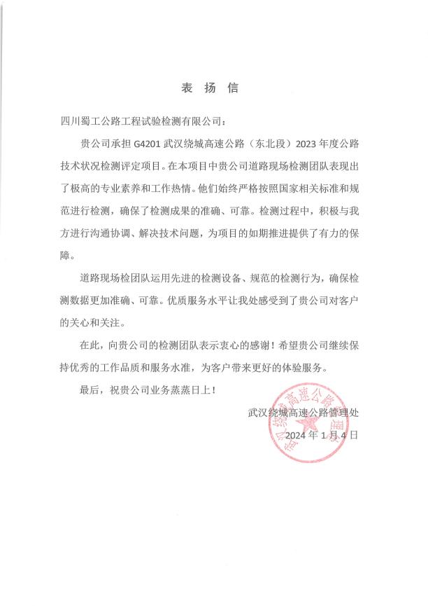 蜀工检测公司湖北联合交通投资开发有限公司高速公路2023年度公路技术状况(MQI)检测结果得到行业主管部门及湖北联合交投公司充分认可,并先后收到由湖北绕城高速、和左高速、汉英高速三个管理处发来表扬信,信中充分肯定了蜀工检测公司在湖北联合交投投资开发有限公司高速公路2023年度公路技术状况(MQI)检测中所作的贡献。