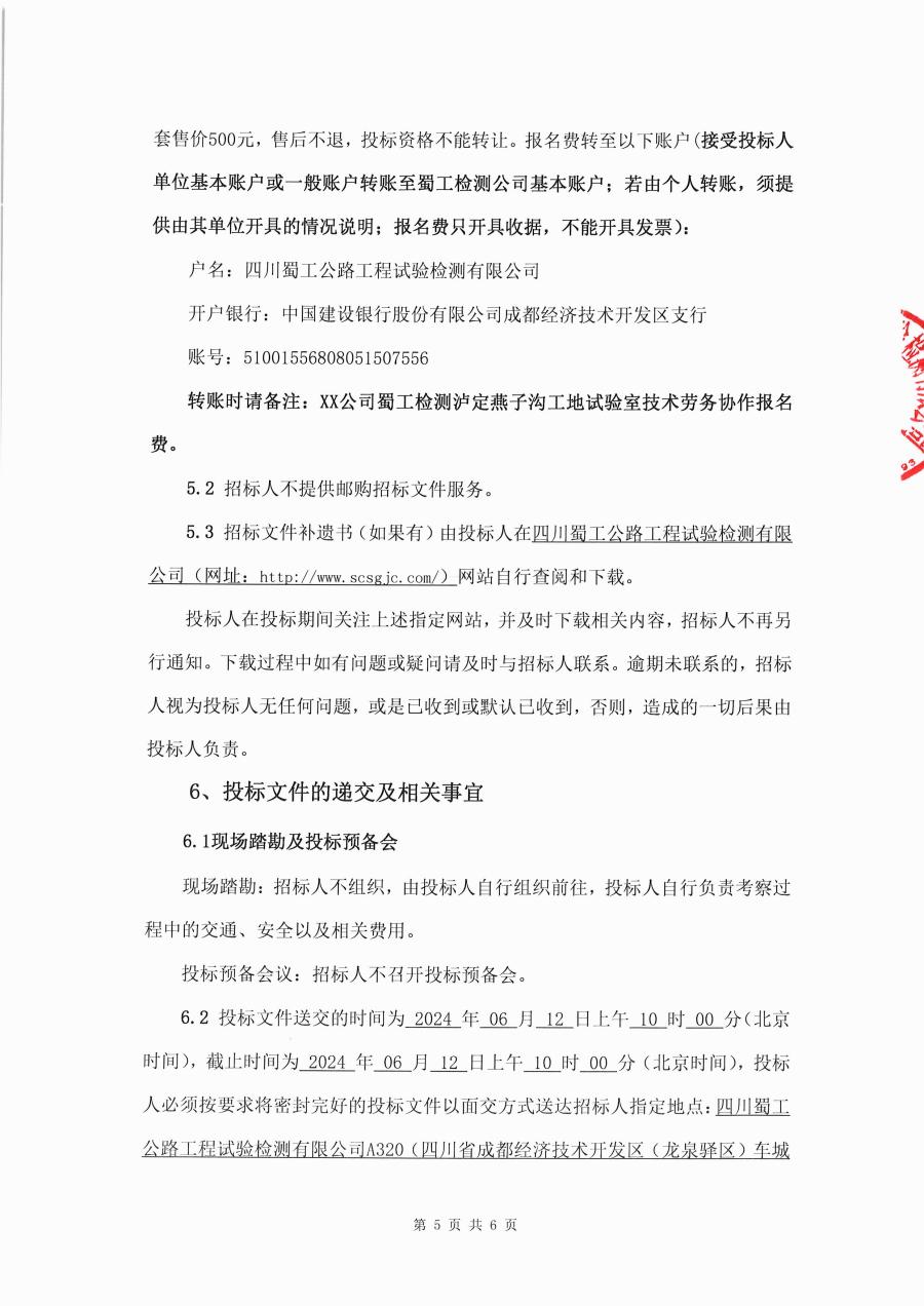 四川蜀工公路工程试验检测有限公司泸定县燕子沟镇至燕子沟景区冰窖口改建工程设计施工总承包(EPC)标段工地试验室专业技术劳务协作招标公告