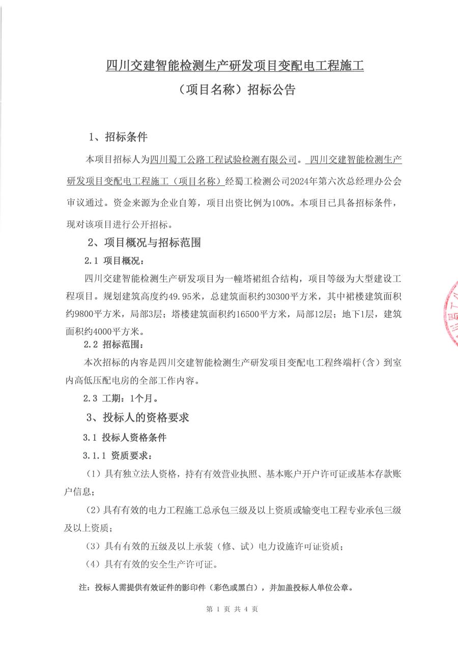 四川交建智能检测生产研发项目变配电工程施工招标公告