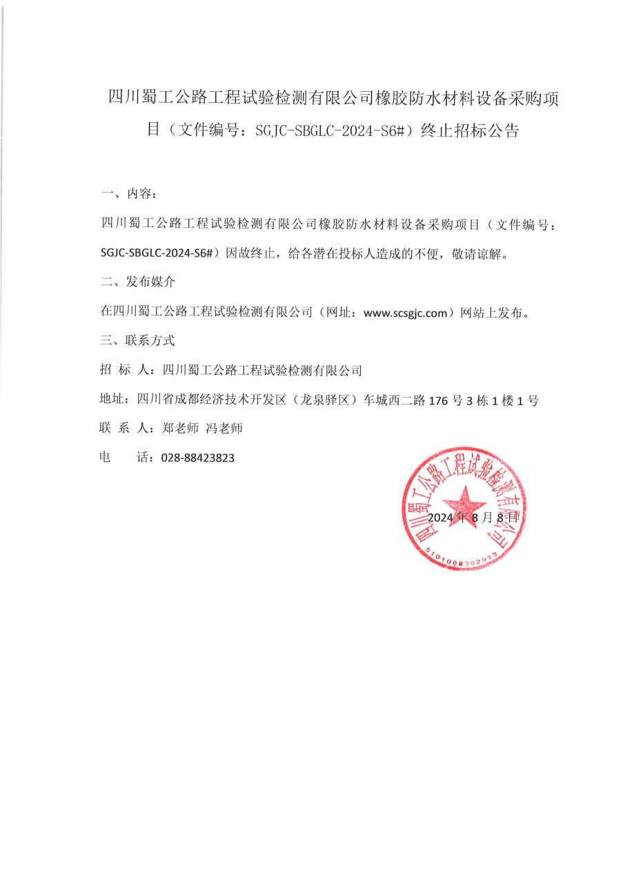 四川蜀工公路工程试验检测有限公司橡胶防水材料设备采购项目(文件编号:SGJC-SBGLC-2024-S6#)终止招标公告