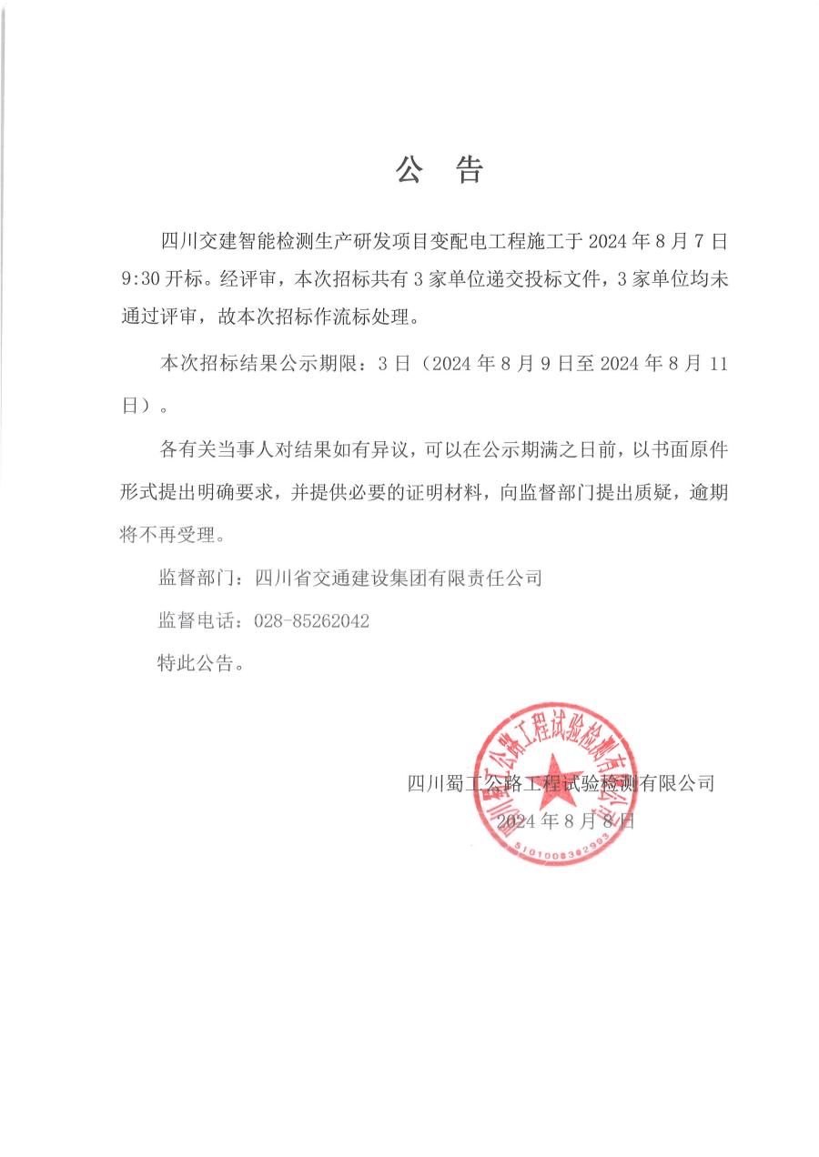 四川交建智能检测生产研发项目变配电工程施工流标公告