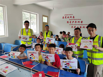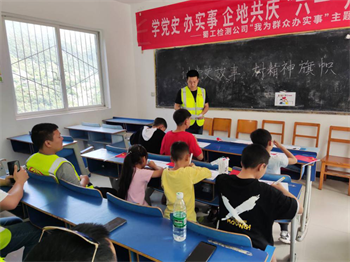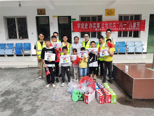党的光辉照我心,党史学习教育进村社。泸石项目 TJ4 标位于泸定县德威乡和得妥镇境内,工地试验室位于德威乡下奎武村。在得知村里有多名贫困家庭留守儿童后,试验室以“六一”关爱儿童为出发点,会同村委会开展“学党史 办实事 企地共庆六一儿童节”及“我为群众办实事”主题实践活动,在送去书包、文具等学习物品和牛奶、饼干等暖心物品的同时,为孩子们带来有趣的党史故事、好听的经典红歌,引导孩子们从自身做起,从现在做起,珍惜时光发奋学习,努力做社会主义现代化国家的建设者和红色接班人。