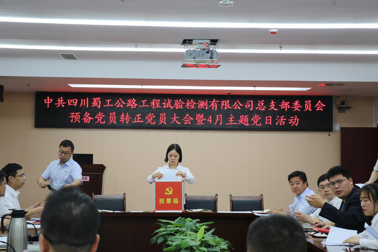 4月28日,检测公司党总支召开预备党员转正党员大会暨4月主题党日活动,会议由党总支书记、董事长倪建军同志主持,检测公司党总支正式党员和预备党员共计40人参加本次会议。检测公司党总支严格按照党员发展程序,讨论预备党员张潇同志转正有关事宜。预备党员张潇同志汇报了自己在预备期间的有关情况,表达了如期转为中共正式党员的意愿和为之奋斗终身的决心。培养联系人景胜和俞伟分别介绍了预备党员张潇同志的主要情况,并对其能否转正表明意见。党总支副书记、副董事长、副总经理周琦森同志代表党总支向党员大会介绍了张潇同志在预备期间教育和考察情况,随后与会党员充分讨论并发表意见,最后进行无记名投票表决。经过全体参会正式党员投票,一致同意张潇同志按期转为中共正式党员。