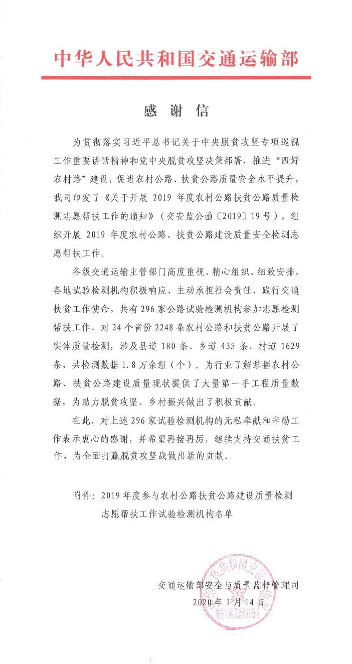 2020年1月16日,交投建设公司子公司蜀工检测公司收到交通运输部发来的感谢信。感谢检测公司2019年度为志愿帮扶农村公路扶贫检测作出的贡献,为行业了解掌握农村公路、扶贫公路建设质量现状提供了大量第一手工程质量数据。